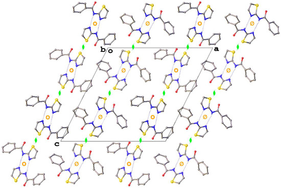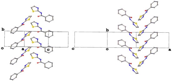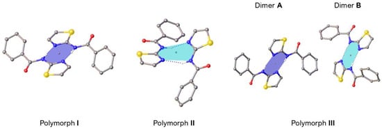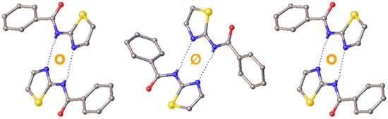 The relative orientation of the two rings in each molecule, as denoted by the sign of the torsion angles, relates also to the formation of dimer units in each of the three polymorphs (Figure 4). These dimers are formed of hydrogen bonds (Table 3), where the amide proton acts as a donor to the thiazolyl nitrogen atom to give a ring motif with the graph set (8) [32]. In polymorph I, the two molecules that comprise the dimer are related by inversion symmetry, whereas in II they are related by a two-fold rotation about the rotation axis of the C2/c space group symmetry, with the dimer appearing twisted out of plane as a result.