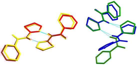 As each of the four molecules comprising the two dimers in polymorph III are crystallographically independent, they are not related by crystallographic symmetry, but closer inspection reveals that they do appear to be related by approximate symmetry. The two molecules of dimer A are related by an approximate inversion, whereas dimer B forms about an approximate two-fold rotation axis. As such, it can be said that polymorph III combines aspects of the structures of polymorphs I and II where the dimers form across a true inversion centre and rotation axis, respectively. To illustrate this, the dimers of polymorphs I and II can be overlaid with the dimer of III that displays the corresponding approximate symmetry, i.e., polymorph I with dimer A of III and polymorph II with dimer B of III (Figure 5).