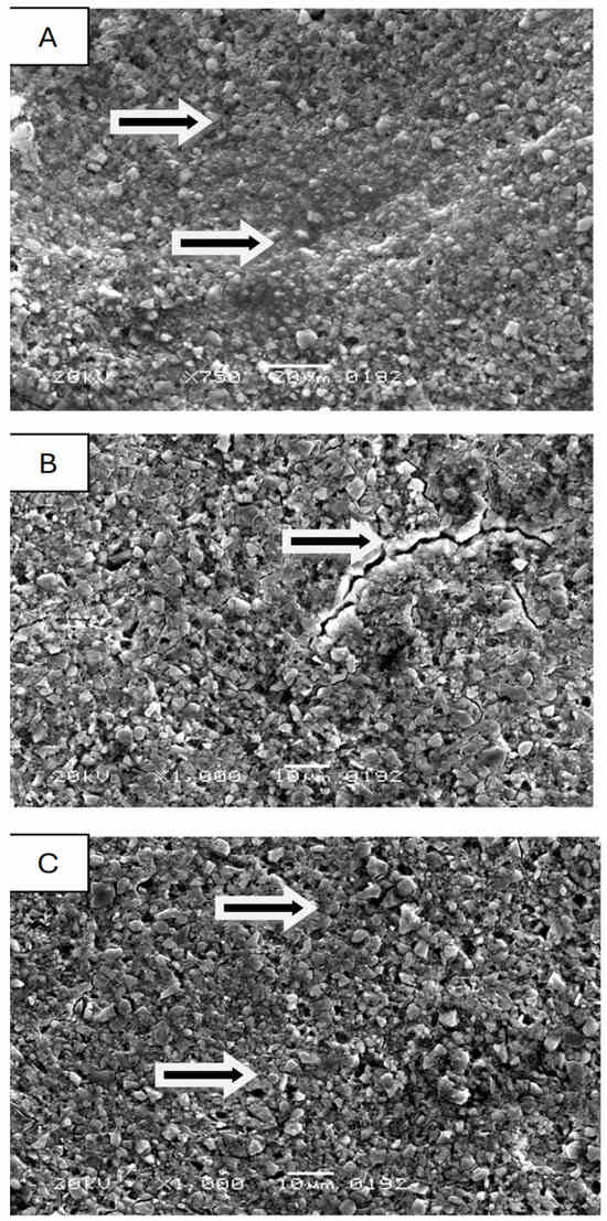 (A) LDC disc conditioned with HFA–Silane. Arrow indicates an area with no loss of matrix. Whereas the area observed is where the matrix is dissolved and the glass is more pronounced. (B) LDC disc conditioned with YFL–Silane. The matrix is dissolved evenly with prominent glass areas. Areas of cracks are seen on the surface due to thermal effect of the laser indicated by arrows. (C) LDC treated with HANPS–Silane. The homogenized loss of the matrix with the prominent structure of glass is shown by the arrows.