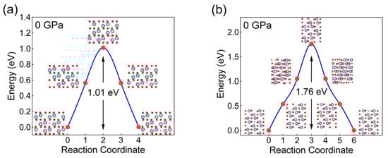where , , , and represent the formation energy, the total energy of the hydrogen-bearing corundum system, the pristine corundum system, and hydrogen, respectively. The calculated formation energies for H (H2) entering into corundum at 0 GPa and 90 GPa are 0.85 eV (−2.23 eV) and 1.98 eV (−0.92 eV), respectively. This indicates that when hydrogen atoms enter corundum, they absorb heat or perform external work, whereas hydrogen molecules release heat upon entry. Additionally, we examined the effect of zero-point energy (ZPE) on the energy barrier for hydrogen diffusion in corundum. The results showed a ZPE correction of −0.1567 eV for a 1.0126 eV diffusion barrier at 0 GPa, and −0.2218 eV for a 1.7170 eV barrier at 90 GPa. For simplicity, this ZPE correction has not been included in the diffusion barriers reported in this study.