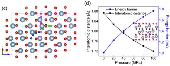 (a,b) The energy barrier and migration pathway of the H atom in corundum at 0 GPa; (c) possible migration pathways of H atoms; (d) the energy barrier of H atom migration in corundum and the interatomic distance between Al and O atoms.