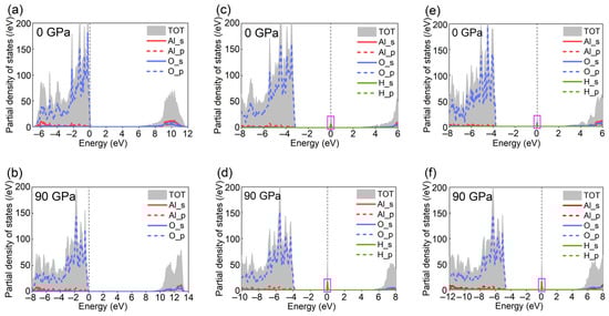 The partial density of states (PDOS) of pristine corundum under 0 GPa (a) and 90 GPa (b). The PDOS of the H atom at the energy minimum under 0 GPa (c) and 90 GPa (d). The PDOS of the H atom at the saddle point under 0 GPa (e) and 90 GPa (f). The vertical dashed line represents the Fermi level.