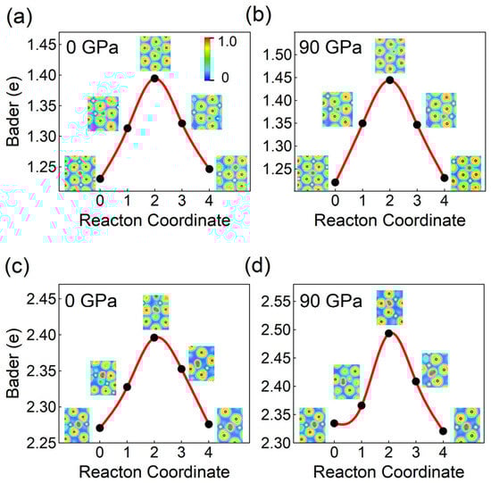 The Bader charge analysis indicates that the H atom carries a charge of 1.23 e (1.39 e) and 1.22 e (1.44 e) under 0 GPa and 90 GPa in corundum at the energy minimum (and at the saddle point), respectively. Pressure induces charge transfer from the corundum lattice to the H atom. The two-dimensional (2D) ELF of H atom diffusion in corundum is displayed in Figure 4a,b. By comparing Figure 4a,b, it is evident that, as the H atom moves along the migration channel, the electrons (represented by the red and green colors) surrounding the H atom do not experience the same squeezing and deflection observed in other minerals [59]. Instead, the electrons consistently remain around the H atom, a property that persists even under high pressure.