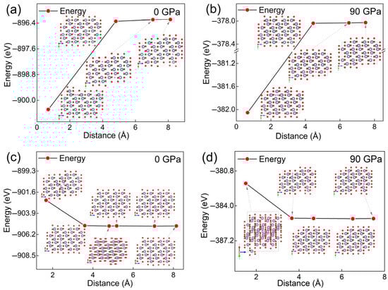 Total energies as a function of the distance between two H atoms under 0 GPa (a) and 90 GPa (b), and between two H2 molecules under 0 GPa (c) and 90 GPa (d).