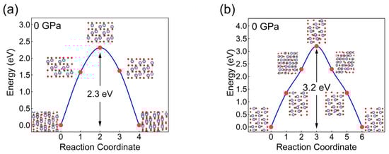 To further investigate the behavior of hydrogen molecule diffusion in corundum, we calculated the minimum energy pathways and energy barriers for H2 diffusion in corundum under various pressures using the CI-NEB method. Figure 6a,b illustrate the diffusion pathway and the corresponding energy barrier of 2.30 eV (3.20 eV) for H2 migration in corundum under 0 GPa. As pressure increases, the energy barrier for H2 migration also increases, rising from 2.30 eV (3.20 eV) at 0 GPa to 3.43 eV (5.89 eV) at 90 GPa. This increase is attributed to the decreasing interatomic spacing between Al and O atoms around the H atom at the saddle point as pressure increases, which hinders the movement of the H2 molecule and raises the energy barrier. A comparison between Figure 2 and Figure 6 reveals that the diffusion energy barriers for H2 molecules are higher than those for H atoms. Despite having the same diffusion pathways in corundum, hydrogen prefers to migrate in its atomic state, even under high pressures.
