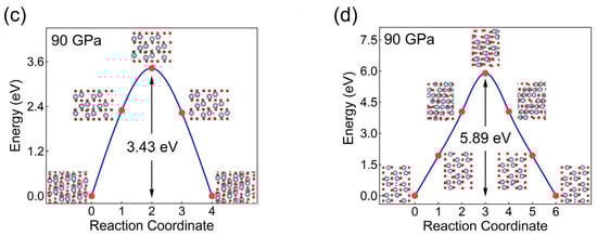 (a,b) The energy barrier and migration pathway of H2 in corundum at 0 GPa; (c,d) the energy barrier and migration pathway of H2 in corundum at 90 GPa.