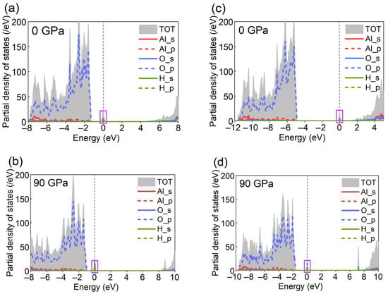 Figure 7a,c show the presence of electronic states near the Fermi level, indicating that H2-bearing corundum, like H-bearing corundum, exhibits metallic characteristics. This property remains under 90 GPa, as shown in Figure 7b,d. This behavior differs from that of periclase, another H2-bearing mineral in the lower mantle, where periclase containing H2 behaves as a semiconductor. The PDOS near the Fermi level is primarily contributed by the s orbital of H and the p orbital of O atoms (see Figure 7a–d), suggesting that H primarily interacts with O. The Bader charge analysis shows that the H2 molecule carries a charge of 2.27 e (2.40 e) at 0 GPa and 2.33 e (2.49 e) at 90 GPa at the energy minimum (at the saddle point), respectively (Figure 4c,d). Similar to H atoms, pressure induces charge transfer from the corundum lattice to H2. Figure 4c,d display the 2D ELF of H2 molecule diffusion in corundum under different pressures. By comparing Figure 4a,b, it is observed that pressure does not significantly restrict the range of electronic motion.