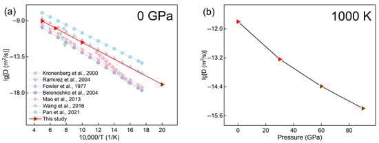 (a) The diffusivity of hydrogen in corundum as a function of temperature at a constant pressure of 0 GPa (For comparison, data from Wang et al. [4], Ramírez et al. [16], Pan et al. [40], Belonoshko et al. [57], Mao et al. [58], Fowler et al. [60], and Kronenberg et al. [61] were replotted from their respective publications). (b) The diffusivity of hydrogen in corundum as a function of pressure at a constant temperature of 1000 K.