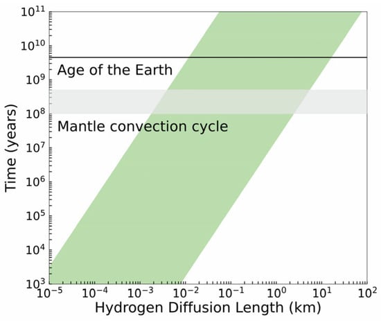 This complex sequence of phase transformations demonstrates that single-phase corundum can indeed exist as a stable phase in specific regions of subducting slabs in the lower mantle. Therefore, the mobility of hydrogen within this phase is a key parameter for understanding the deep water cycle. Hydrous minerals in subducted oceanic crust may transport substantial amounts of water into Earth’s deep interior, potentially reaching as far as the core–mantle boundary [71]. Additionally, the low D/H ratio in lavas from Baffin Island and Iceland suggests the presence of primordial hydrogen reservoirs in the lower mantle [72]. Experimental and observational studies have further indicated a heterogeneous distribution of water in the mantle transition zone [73,74,75]. To evaluate the impact of hydrogen diffusivity on this distribution, the hydrogen diffusion lengths in corundum were calculated using the diffusion coefficients determined in this study, based on the mantle geotherm (Figure 9) [76]. Assuming a mantle convection velocity of 5 cm per year, the estimated timescale for a complete mantle convection cycle is approximately 100–500 million years [25,77,78]. The calculated hydrogen diffusion lengths in corundum show a maximum value of approximately 5.4 km, a distance reached only under the most favorable shallow mantle conditions. This maximum length is largely independent of water content or initial hydrogen incorporation mechanisms. Moreover, hydrogen diffusion may slow further when coupled with cation vacancies [25], resulting in even shorter diffusion lengths.
