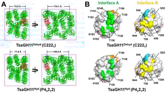 Crystal packing and interface residues of TsaGH11Dehyd and TsaGH11Hyd crystals. (A) Crystal packing of TsaGH11Dehyd TsaGH11 (space group C2221) and TsaGH11Hyd (space group P43212). The superimposed TsaGH11 molecules from TsaGH11Dehyd and TsaGH11Hyd are shown in red. The distance between the TsaGH11 molecules was measured between the Cα atoms of the Glu105 residues. (B) Surface representation of residues in Molecule A located at interfaces A (green) and B (yellow), which are involved in crystal packing. Interfaces C, D, and E in Molecule A are colored orange, cyan, and pink, respectively.