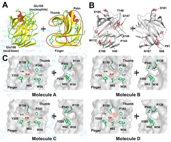 To further understand the molecular flexibility of TsaGH11, B-factor analysis was performed. The B-factor putty representation revealed the relative rigidity of Molecules A and B, but high flexibility of Molecules C and D (Figure 4A). Molecules A and B were surrounded by neighboring molecules within the crystal packing, which likely contributed to the rigidity of their conformations. In contrast, the thumb and finger domains of Molecules C and D were exposed to solvent channels in the crystal packing, increasing their flexibility (Supplementary Figure S5). B-factor analysis of individual amino acid residues revealed that Molecules A and B exhibited B-factor values below 40 Å2 across the finger, palm, and thumb domains, and no significant molecular flexibility was observed (Figure 4B). In contrast, Molecules C and D showed relatively high molecular flexibility in these three domains, particularly in the thumb domain (Figure 4B). Although there were similar B-factor trends of Molecules A and B and Molecules C and D overall, notable differences were observed in the flexibility of specific regions. For example, in the region around Gly40 in the finger domain, Molecule C displayed higher B-factor values than Molecule D, whereas in the thumb domain the opposite pattern was exhibited (Figure 4B). Therefore, the TsaGH11Dehyd crystal allowed determination of a greater number of molecules within the asymmetric unit compared with previous structures, enabling the structural flexibility to be more comprehensively analyzed. Because the thumb and finger domains of Molecules C and D, which are associated with the substrate-binding cleft, do not interact with neighboring molecules, the observed molecular flexibility in these regions is considered to be more biologically relevant.