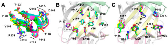 To obtain a deeper understanding of the molecular flexibility of TsaGH11Dehyd, four TsaGH11 molecules from the asymmetric unit were compared. The superimposition of these molecules showed a root-mean-square deviation (RMSD) of 0.155–0.266 Å. In the superimposed structures, the amino acid main chain exhibited the largest structural changes in the thumb domain (Figure 3A and Supplementary Figure S4). Upon superimposition of the thumb domain (Thr138–Thr152) of the four molecules, an RMSD of 0.124–0.334 Å was determined. There was variation in the main chain positions in the thumb domain, with Arg139, Val140, Asn141, Thr148, and Gln149 displaying conformational diversity in their side chains (Figure 3A). Among these, the side chains of Arg139 exhibited the most significant structural changes, as this residue is involved in determining the width of the substrate-binding cleft. Meanwhile, the side chains of Asp146 showed minimal conformational changes, as this amino acid interacts with neighboring Arg100 residues. Next, the structural flexibility of the substrate-binding cleft and catalytic residues was analyzed. The conserved amino acids located within the substrate-binding cleft exhibited relatively rigid conformations (Figure 3B). In particular, the amino acids Pro117, Tyr107, Tyr96, Tyr192, and Trp98 in the palm domain, where the substrate binds, displayed almost identical conformations in the main and side chains. In contrast, the side chains of Tyr92 and Gln153 exhibited positional shifts, showing relative flexibility within 1.07 Å. The conformational changes in the side chains of the catalytic residues Glu105 and Glu198 were observed to be within <1 Å. In the finger domain, the side chains of Tyr115 and Tyr200 in the thumb domain exhibited relatively large changes in conformation, with the most significant positional change in the side chain being <1.07 Å. Meanwhile, the amino acids in the solvent-exposed regions of the thumb and finger domains showed greater molecular flexibility than those in the palm domain (Figure 3C). The side chain of Arg139 in the thumb domain adopted distinct conformations with a rotational shift of over 43°, demonstrating conformational flexibility in the solvent-exposed region. The position of the main chain of Pro143 in the thumb domain was shifted by approximately 0.7 Å. In the finger domain, positional shifts in the side chains of Trp36 and Tyr115 were observed, which peaked at 2.84 Å and 0.66 Å, respectively. Meanwhile, the side chain of Tyr200 was rotated by up to 60°. Conversely, the conserved Asn62 and Asn90 in the finger domain maintained relatively rigid conformations. These results indicate that the conserved residues on the substrate-binding cleft were rigid in the dehydrated environment, whereas the solvent channel-exposed residues were relatively flexible.