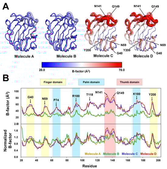 B-factor analysis of TsaGH11Dehyd. (A) B-factor putty representation of the four TsaGH11Dehyd molecules in the asymmetric unit. (B) B-factor and normalized B-factor plots of the four TsaGH11Dehyd molecules. The finger, palm, and thumb domains are highlighted in yellow, blue, and red, respectively.