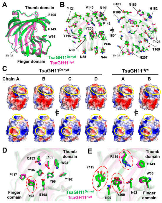Structural comparison of TsaGH11Dehyd and TsaGH11Hyd. (A) Surface view of the superimposed structures of TsaGH11Dehyd (cyan) and TsaGH11Hyd (PDB code: 8YEA, pink). (B) Close-up view of the superimposed thumb domains of TsaGH11Dehyd and TsaGH11Hyd. (C) Electrostatic surfaces of TsaGH11Dehyd and TsaGH11Hyd. Significantly different regions are indicated by yellow dotted circles. Differences in charge distribution are indicated by yellow circles. (D) Superimposition of residues involved in the active site and substrate-binding cleft on the palm domain of TsaGH11Dehyd and TsaGH11Hyd. (E) Superimposition of residues located above the substrate-binding cleft of TsaGH11Dehyd and TsaGH11Hyd. The flexible residues are marked by red dotted circles.