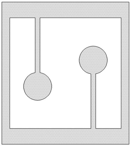 Acoustic metamaterials are generally classified into Bragg Scattering Metamaterials and Local Resonance Metamaterials. Bragg Scattering Metamaterials are based on the Bragg scattering phenomenon of sound waves in periodic structures. Their characteristic is the design of regular periodic structures, which will produce interference effects within a specific frequency range, causing the reflection or transmission of sound waves to be interrupted, thereby forming an acoustic band gap. The working principle of local resonant metamaterials is based on the resonance phenomenon of local structures. These materials usually contain elastic elements or mass elements inside, which can generate resonance at specific frequencies. By ingeniously designing these resonant frequencies, local structures can significantly reduce the propagation of sound waves at specific frequencies. The design of this metamaterial does not require the structure to be periodic but relies on local resonant phenomena within it. The AMMs in this study belong to local resonance metamaterials. The basic unit is composed of a square frame and two local resonance units with the same additional mass. The position of the additional mass is the circular region of the two local resonance units, as shown in Figure 1. When AMMs receive frequency excitation from an external vibration source, local resonant units vibrate, and when the frequency of the elastic wave is close to the resonant frequency of the resonant unit, these local resonant elements absorb and hinder the propagation of sound waves at that frequency, forming a bandgap. In addition, the additional mass at the local resonant unit position can reduce the resonant frequency to achieve vibration control in the low frequency range.
