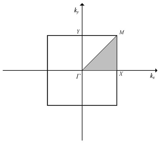 where K is the structural stiffness matrix and M is the structural mass matrix. Due to periodicity, the wave vector can be limited to the first Brillouin zone, as shown in Figure 2, and the bandgap curve can be accurately obtained by searching for wave vector points (Γ→X, X→M, and M→Γ) on the Brillouin zone boundary. Considering the computational cost of the training data, only the first four bandgap curves are calculated, and the parameter sweep range of k of the wave vector is 0–3 and the step size is 0.05.
