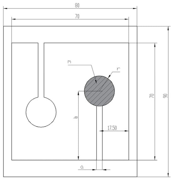 In general, DL requires a sufficient amount of data of good quality to obtain accurate results. Therefore, it is necessary to obtain a dataset with a large number of AMMs samples. In the simulation and experimental tests, the square frame of the AMMs is constrained, that is, the size parameters of the square frame do not affect the resonant frequency of the resonant unit. The parameters that affect the resonant frequency of the basic unit are shown in Figure 3. The four design parameters are the thickness of the cantilever beam (a), the length from the cantilever beam to the center of the circle (b), the radius of the circular area (r), and the additional mass within the area of a single circle (m). The remaining parameters that do not affect the bandgap range are shown in Figure 3, with the unit being millimeters.