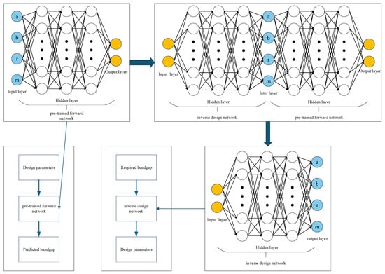 The complete training process is shown in Figure 5. The first is the training of the pre-trained network, the specific details of which have been described in detail above and will not be repeated here. It is important to note that the weights and biases in the pre-trained network are no longer updated after the training is completed. The second is the training of the tandem neural network, which consists of an inverse design network and a pre-trained network, and the output of the inverse design network is used as the input of the pre-trained network. It should also be noted that the pre-trained network during the training process of the tandem neural network has been trained before, and the update of weights and biases only occurs in the inverse design network, and the input and output are both bandgap ranges. Finally, after the training of the tandem neural network is completed, the inverse design network is separated from the tandem neural network as an independent neural network model; the weight and bias of the inverse design network are also fixed, and the inverse design network can output design parameters according to the required bandgap range.