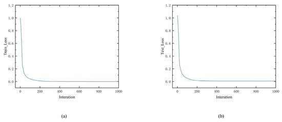 In the pre-trained network, 80% of the 1024 sets of data obtained were divided into training sets, and the remaining 20% were divided into test sets. After multiple iterations of training on the pre-trained network, the loss function is used to measure the gap between the output of the model and the target value so as to evaluate the training effect of the pre-trained network. The training process and all numerical experiments were performed on a Chinese PowerColor AMD Radeon RX 6750 GRE 10 GB GPU and a Chinese AMD Ryzen 5 7500F CPU, but the actual CPU-only version of PyTorch was installed because the GPU did not have CUDA cores. Figure 6a,b represents the training loss function curve and the test loss function curve for the first 1000 iterations of pre-training, respectively. At 200 iterations, it can be found that the loss functions of training and testing converge to a very small value, which indicates that the pre-trained network has been well trained. The total time spent on 1000 iterations of the pre-trained network is 1.22 s, and the average time of one iteration is 0.00122 s.