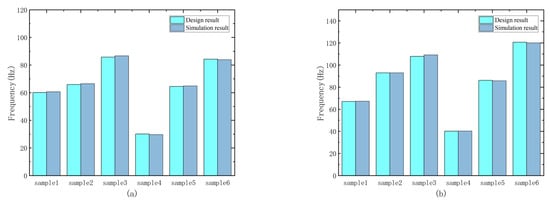 The forward design of AMMs can be achieved through a pre-trained network, and the bandgap range can be quickly derived by inputting design parameters. To test the network performance, we randomly input six sets of design parameters and use the pre-trained network and simulation software to obtain the bandgap range. Table 1 shows the comparison of the bandgap results obtained by different methods for these six sets of design parameters, and the error rate is the average error between the predicted upper and lower limits and the upper and lower limits calculated by simulation. Figure 7 shows the upper and lower limits of the bandgap obtained by the network output and simulation calculations. The upper and lower limits of the bandgap obtained by the network are almost the same as those obtained by the simulation calculation, and the error rate is also very low. It can be concluded that the accuracy of the forward prediction of the pre-trained network is very high.