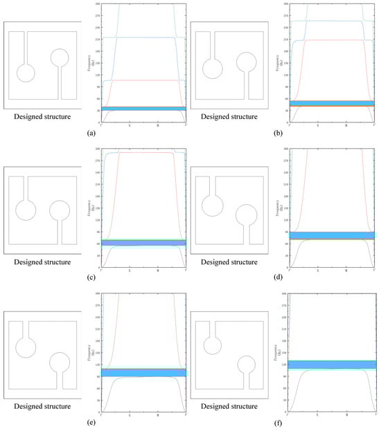 Basic units and corresponding bandgap plots with different structural parameters. (a) The input bandgap is 30–40 Hz; (b) The input bandgap is 40–55 Hz; (c) The input bandgap is 55–70 Hz; (d) The input bandgap is 70–90 Hz; (e) The input bandgap is 90–110 Hz; (f) The input bandgap is 110–130 Hz.