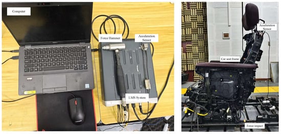 We selected the problem frequency at the seat back frame of the vehicle to design the AMMs, and we used the inverse design network to design AMMs and experiment on car seats. Figure 10 shows the experimental equipment and measurement scheme, which consists of an LMS system, a hammer, an accelerometer, and a laptop computer. An accelerometer is installed at the seat frame of the vehicle, a hammer is used to tap the position of the rail under the seat, and the frequency response curve in the range of 0–100 Hz is obtained through the LMS system, as shown in Figure 11. We can find that the vibration response of the vehicle seat back frame in the frequency range of 33–40 Hz is large, we set the required bandgap frequency to 32–41 Hz to input the inverse design network, and we get the results shown in Figure 12a, and the bandgap characteristics are shown in Figure 12b. The bandgap range calculated by simulation is 32.5–39.8 Hz.