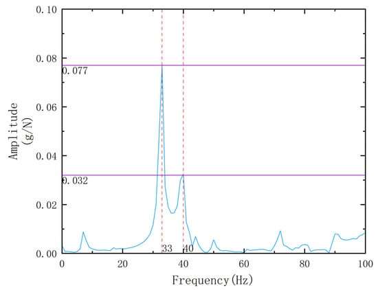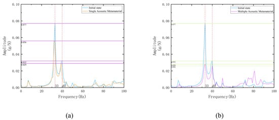 Once the arrangement is complete, a hammer is used at the striking point to obtain its vibration response in the frequency range of 0–100 Hz. As shown in Figure 16, there is a significant decrease in the vibration response in the frequency range of 32–40 Hz, with a vibration attenuation of about 27.3% at 33 Hz from 0.077 to 0.056 in the case of a single AMMs arrangement, and a decrease of about 63.6% in the case of multiple AMMs in the case of a single AMMs arrangement. The reason for the lower vibration attenuation at 40 Hz may be that the actual upper limit of the bandgap does not fully cover 40 Hz. Overall, however, AMMs do absorb vibrational energy effectively and are in line with the designed bandgap range. The experimental results show that the bandgap characteristics obtained by inverse design are reliable.