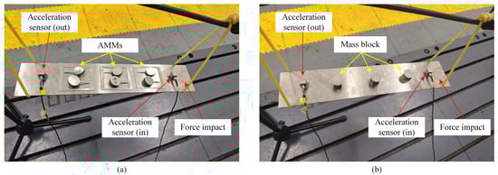 The AMMs in Figure 12a were processed. The processing thickness is 0.9 mm, the material is 304 stainless steel, and the material properties are as follows: the elastic modulus E = 190 GPa, the material density ρ = 7930 kg/m3 and the Poisson’s ratio υ = 0.27. As shown in Figure 13, we arranged three AMMs and mass blocks of the same mass at intervals of 10 cm on a horizontal beam, respectively, and fixed them with cyanoacrylate instant adhesive. The horizontal beam is 50 cm long, 10 cm wide, and 2 cm thick, and is made of steel. Both ends are suspended horizontally by elastic ropes. There is an acceleration sensor on each side of the horizontal beam. The acceleration sensor on the left serves as the response point, and the one on the right serves as the excitation point. A force hammer is used as the excitation source to strike near the right side of the excitation point. After obtaining the sensor signal and the exciter signal through the data acquisition system, the transmission coefficient can be expressed as in Equation (6):