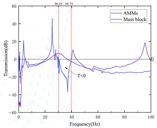 The transfer coefficients of AMMs and the mass block within the range of 0–100 Hz are shown in Figure 14. The transfer coefficient of the mass block fluctuates around 0 within the range of 30.25–39.75 Hz, while the transfer coefficient of AMMs is less than 0 within the range of 30.25–39.75 Hz. This is because the AMMs in this paper are local resonance metamaterials. When the wave propagates within the range of 30.25–39.75 Hz, the local structure of AMMs resonates with the wave and consumes energy, generating a bandgap in this frequency band. That is, the bandgap range measured by the AMMs experiment is 30.25–39.75 Hz, which has a certain error compared with the bandgap range of 32.5–39.8 Hz calculated by the simulation. This part of the error may be due to the fact that the instant adhesive fixation of cyanoacrylate fails to meet the ideal constraint of the simulation calculation, or it could be the experimental error caused by the certain inclination of the horizontal beam. Although there are some errors between the theoretical and experimental results, the simulation calculation and the experimental results are basically consistent.