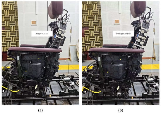 Next, verify the vibration damping effect of AMMs on the car seat back frame. After attaching 28 g circular mass sheets to the AMMs, arrange them on the car seat back frame and fix them with cyanoacrylate instant adhesive. Due to the space limitation of the car seat back frame, multiple AMMs are arranged by bonding three AMMs end to end to the car seat back frame. The specific layout plan is shown in Figure 15.