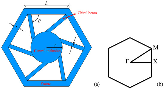 The designed elastic metamaterial is composed of a periodically arranged unit cell with a regular hexagonal topology, entirely constructed from single-phase aluminum, characterized by Young’s modulus E = 70 GPa, Poisson’s ratio v = 0.33, and density ρ = 2700 kg/m3, as shown in Figure 1a. Each unit cell comprises an outer hexagonal ring of side length L = 10 mm and thickness t = 1.2 mm, enclosing a central circular inclusion with radius r = 5 mm. The two components are linked by six narrow rectangular beams of width d = 0.15 mm, which are evenly distributed and inclined at an angle θ = 80° relative to the corresponding side of the hexagonal outer frame, introducing a chiral geometric feature. These slender beams are intentionally engineered with reduced cross-sectional dimensions to serve as flexible connectors.