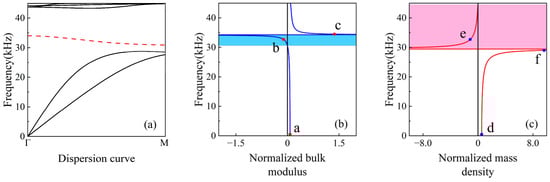 (a) Dispersion curves of the proposed metamaterial under plane-strain (2D) conditions. The dashed red line indicates the third dispersion branch corresponding to the double-negative frequency region, where both effective mass density and bulk modulus are negative; (b) effective bulk modulus, and (c) effective mass density of the proposed single-phase metamaterials.