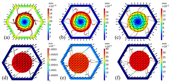 Modal analysis results of the proposed chiral metamaterial unit cell at different frequencies. The displacement fields and local motion patterns illustrate the mechanisms behind negative effective parameters. Panels (a–c) correspond to bulk modulus-related modes obtained using displacement excitation described in Equation (A4), while panels (d–f) correspond to mass density-related modes obtained using displacement excitation described in Equation (A3). The letters (a–f) here directly match the designations in Figure 2. Four frequencies are analyzed: 500 Hz, 29 kHz, 32.7 kHz, and 34.5 kHz. Arrows indicate local displacement vectors; (a) At 500 Hz (below the effective modulus resonance), the outer frame expands outward, inducing a clockwise rotation of the central inclusion via the chiral beams, corresponding to a positive effective bulk modulus; (b) At 32.7 kHz, the central inclusion undergoes a pronounced clockwise rotation, driving frame expansion and resulting in a negative bulk modulus; (c) At 34.5 kHz (near the peak of the effective modulus), the inclusion rotates counterclockwise, resisting frame expansion and leading to a large positive bulk modulus; (d) At 500 Hz, both the outer frame and inclusion move in the same direction, indicating positive effective mass density; (e) At 32.7 kHz, the inclusion and outer frame move in opposite directions, with the inclusion exhibiting larger displacement, leading to negative mass density; (f) At 29 kHz, the frame and inclusion move in the same direction with slight displacement difference, resulting in positive mass density.