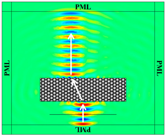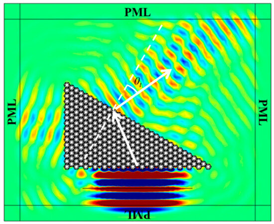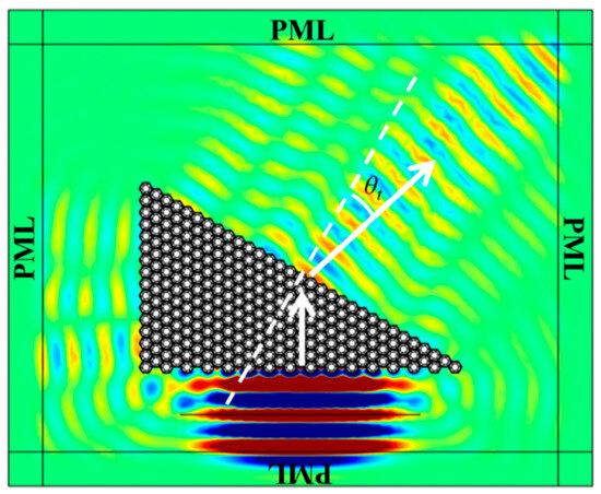 The verification of negative refraction was carried out through frequency-domain analysis in the acoustic-solid interaction module of COMSOL Multiphysics 6.0. We assembled 256 unit cells into a triangular prism-shaped metamaterial wedge with a base angle of 30°, embedded in water as the background medium with density ρ = 1000 kg/m3, sound speed c = 1500 m/s. The surrounding boundaries were treated with Perfectly Matched Layers (PML) to eliminate reflection artifacts, as shown in Figure 4. A 32.7 kHz Gaussian beam was normally incident on the wedge boundary. At this frequency, the effective parameters are: effective density ρeff = −2259 kg/m3, effective bulk modulus Keff = −7.98 GPa, and effective shear modulus ueff = 3.01 GPa. Simulation results indicate that the transmitted wave inside water bends toward the same side of the normal as the incident beam, confirming negative refraction. The wave enters the metamaterial from the water medium normally and is refracted by the metamaterial wedge structure. As shown by the white arrows, the refracted wave and the incident wave are on the same side of the normal, indicating a negative refraction effect. This unusual behavior is characteristic of metamaterials with negative effective mass density and negative effective modulus, as the waves are guided along paths opposite to the typical refraction expected in conventional materials.