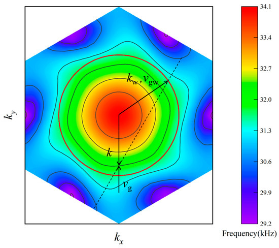 Figure 5 presents the EFCs of the metamaterial at 32.7 kHz, which is crucial for understanding the propagation characteristics of the acoustic waves. The EFCs depict the relationship between the frequency and wave vector components in the periodic medium. The red circle represents the sound line of water, indicating the propagation of sound at the speed of sound in water. vg and k are the group velocity and wave vector in metamaterial, respectively. vgw and kw are the group velocity and wave vector in water, respectively. The color gradient illustrates the frequency distribution, where the red regions correspond to higher frequencies and blue regions to lower frequencies.