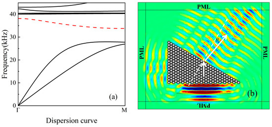 (a) Dispersion curve (the negative band is indicated by a red dashed line) and (b) negative refraction result at 36 kHz for a chiral beam inclination angle of 84°.