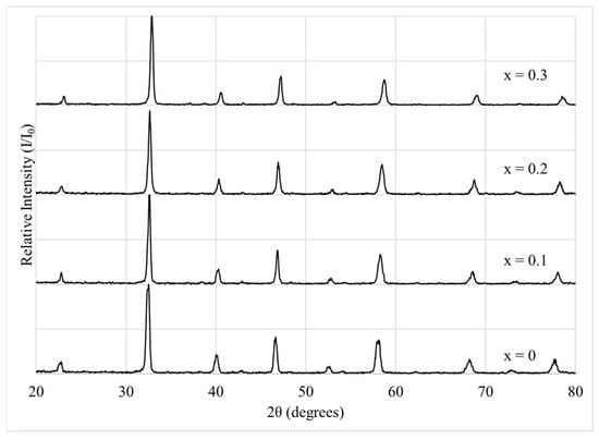 XRD patterns for all powders produced according to Section 2.1 are shown in Figure 1 (a larger version of Figure 1 appears in the Supplementary Material as Figure S1). For all four La1−xCax(Co0.2Cr0.2Fe0.2Mn0.2Ni0.2)O3−δ materials (x varying from 0 to 0.3), the peaks present match those expected for perovskite oxides. All patterns were well indexed based on orthorhombic perovskite structures, using reference patterns from the Crystallography Open Database: LaCrO3 (Pnma, space group 62, ID# 1526176) and La0.8Ca0.2CrO3 (Pnma, space group 62, ID# 1531964). The observed reflections align with characteristic peaks for orthorhombic symmetry, including (002), (112), (202), (004), (024), (025), and (116). No secondary phases were detected, indicating that all samples were single-phase within the detection limits of the instrument (approximately 5 wt%). SEM imaging (see Section 3.3) further verified the absence of minor impurity phases not visible in the XRD patterns.