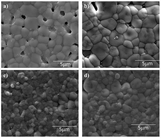 SEM images of the surfaces of thermally etched, sintered pellets of La1−xCax(Co0.2Cr0.2Fe0.2Mn0.2Ni0.2)O3−δ are shown in Figure 2. Figure 2a, for the x = 0 material, shows significant porosity, both in size and frequency (a larger version of Figure 2a appears in the Supplementary Material as Figure S2). The grains also have irregular shape and varying size. The grain structure stands in stark contrast to that of Figure 2b, the x = 0.1 material (a larger version of Figure 2b appears in the Supplementary Material as Figure S3). The grains are still irregular in shape and vary in size, but they nonetheless possess a rounder character than in Figure 2a. Also, the amount of porosity has greatly decreased. Figure 2c shows that the x = 0.2 material has smaller grains with a more uniform size and round shape than the materials with less calcium content (a larger version of Figure 2c appears in the Supplementary Material as Figure S4). Figure 2d shows the x = 0.3 material, which has the smallest grains, and they have the most uniform size and shape (a larger version of Figure 2d appears in the Supplementary Material as Figure S5). None of the calcium-doped materials (Figure 2b–d) display a second, grain boundary phase. This, combined with improved density (inferred from reduced porosity) and more rounded grains, indicates that any calcium that might have aided sintering as a liquid phase was transient and absorbed back into the perovskite structure rather than precipitating along grain boundaries [,]. In addition, the presence of calcium increased the average grain size compared to the calcium-free material. These results were expected based on results of similar perovskite oxides [,].