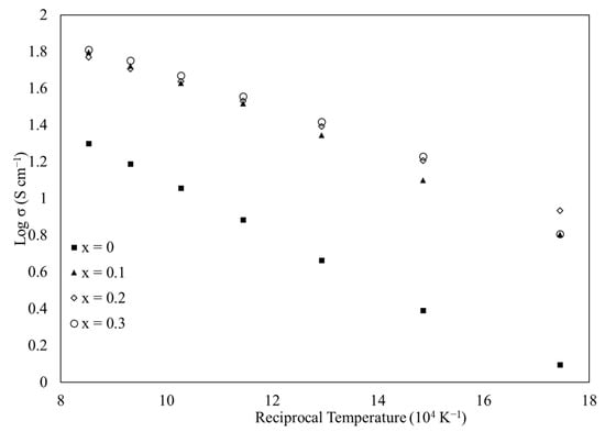where A is a constant, T is absolute temperature, Ec is the activation energy, and k is Boltzmann’s constant (8.617 × 10−5 eV K−1). Equation (1) has two cases, adiabatic and non-adiabatic. For the former, the exponent s = 1, while for the latter s = . When Equation (1) is plotted on a semi-log basis, e.g., for s = 1, if the data are linear, then (in this case) the conductivity is adiabatic.