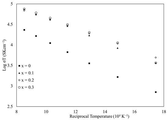 Semi-log plot of σT versus reciprocal temperature (104 K−1) for sintered La1−xCax(Co0.2Cr0.2Fe0.2Mn0.2Ni0.2)O3−δ.