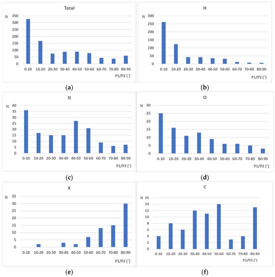 Distributions of P1/P2 angles for structures with different atoms in the ortho position with respect to the studied NO2 groups. Distribution for (a) all NO2 groups in extracted structures, (b) NO2 groups with a H atom as the atom in the ortho position, (c) NO2 groups with a N atom as the atom in the ortho position, (d) NO2 groups with O atom as atom in the ortho position, (e) NO2 groups with a halogen atom (X) as the atom in the ortho position, and (f) NO2 groups with a C atom as the atom in the ortho position were separately analyzed.