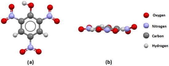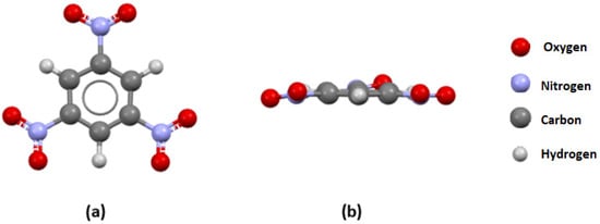 (a) A front view and (b) a side view of the TNB molecule extracted from the TNBENZ10 crystal structure.