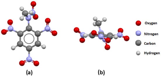 (a) A front view and (b) a side view of the TETRYL molecule extracted from the MTNANL crystal structure.