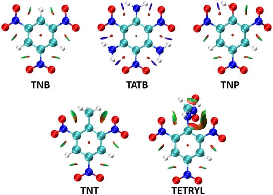 Calculated NCI plots for optimized geometries of TNB (1,3,5-Trinitrobenzene), TATB (2,4,6-triamino-1,3,5-trinitrobenzene), TNP (2,4,6-Trinitrophenol), TNT (2,4,6-Trinitrotoluene), and the TETRYL (2,4,6-Trinitrophenylmethylnitramine) molecules. Blue surfaces represent strongly attractive areas of non-covalent interactions, green surfaces represent moderately attractive interactions, and brown areas represent repulsive interactions (the selected isosurface value was 0.5, while the color range was in the interval of −0.035 to 0.02). Red atoms represent oxygen, dark blue atoms nitrogen, pale blue atoms carbon and white atoms hydrogen.