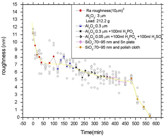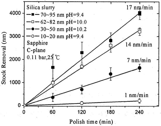 Figure 1 shows the typical reduction in roughness as polishing time increases. After a few hours of polishing, the surface roughness obtained is around 5–8 nm. Adding H3PO4 (85%) can further reduce the roughness, but this method is not very effective. In the final stage, a softer colloidal silica slurry is applied to reach the final goal. The primary mechanism of etching the surface in this stage is the chemical reaction on the sapphire surface. Figure 1 also illustrates the typical roughness reduction as a function of polishing time when different slurries are used. It demonstrates an effective method of reducing sapphire surface roughness using colloidal silica slurry in the final stage. Applying a pressure of either 112 g (0.05 bar) or 212 g (0.11 bar) to the top of the polishing stage also reduces surface roughness, as can be seen in Figure 2. Here, we can see that roughness reduces quickly during the γ-Al2O3 polishing stage when a heavier load is applied. Although heavy loads result in faster roughness reduction initially, up to a roughness of about 6 nm, there is little difference in the time taken to achieve the lowest surface roughness with epitaxial quality. At the final stage of SiO2 polishing, applied pressure is no longer a significant factor, which corroborates the hydrothermal wear model of surface chemical reactions proposed by B. Hader and O. Weis [2,4,10]. Perhaps the primary polishing mechanism is the chemical formation of Al2Si2O7 ·2H2O, which is then removed from the surface. Figure 3 shows the stock removal rate measured at different colloidal SiO2 particle sizes. Contrary to the prediction of a chemical reaction-dominated process, it appears that larger particle sizes give rise to a higher removal rate. If CMP were solely due to chemical reactions, then the smaller colloidal size with a greater surface area would produce a higher removal rate. The hydrothermal wear model should be scrutinized further. Surprisingly, the stock removal rate at heavy load for γ-Al2O3 (3 µm, 0.11 bar) polishing is negative (−6 nm/min). It seems that γ-Al2O3 is being deposited on the α-Al2O3 surface during polishing.