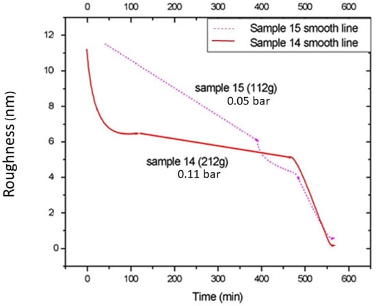 The general trend in the reduction in surface roughness via applying pressure with loading values of 112 g (0.05 bar) and 212 g (0.11 bar). Data are smoothened.