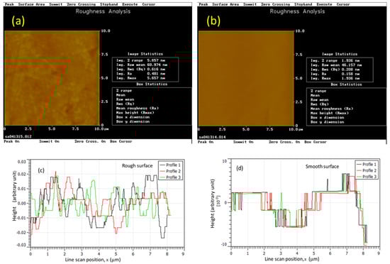 AFM surface morphology: (a) Ra = 0.481 nm; (b) Ra = 0.158 nm. (c) Three-line scan profiles on the rough surface (a,d) three-line scan profiles on the smooth surface (b). The three lines are separated by 2.5 μm in the y-direction. The vertical range of (c) is three times larger compared to that of (d). As shown in (b), the surface is featureless when Ra = 0.158 nm, indicating that a smooth surface was prepared.