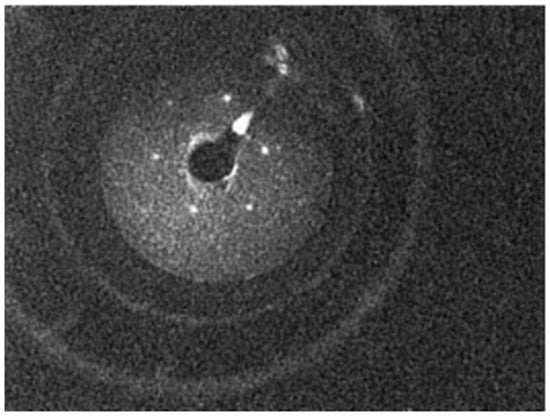 For successful epitaxial growth, the top surface of the substrate must be smooth, clean, and free from atomic disorder. Figure 4 shows a typical AFM image of colloidal SiO2 polishing. As polishing time increases, the roughness (Ra) value decreases. However, the Ra value eventually stabilizes at around 0.1–0.3 nm. Figure 4a,b show examples of AFM surface morphology with Ra values of 0.481 nm and 0.158 nm, respectively. The scanning area is 10 μm × 10 μm. For the sample with Ra = 0.158 nm, the surface is featureless and smooth. Figure 4c,d plot three-line scan profiles, with each line separated by 2.5 μm in the y-direction. From Figure 4d, flat terraces of 1–2 μm wide can be identified on a smooth surface. Figure 5 shows the EDS measurement of the surface, revealing the presence of only Al, O, and C elements. The atomic percentages are Al:O:C = 28:65:6, indicating the presence of an organic thin film on the surface. This organic contamination can easily be removed by solvents and then by heating the sample at 130 °C in a vacuum of 10−8 Torr. No LEED pattern was observed before heating the sample in a high vacuum. Afterwards, a clear hexagonal LEED diffraction pattern was observed (see Figure 6). The LEED intensity remains similar after heat treatment at higher temperatures up to 300 °C, indicating that most of the organic contamination has been removed. This result also demonstrates that the top one to two monolayers of atoms are arranged in well-ordered hexagonal symmetry, indicating that the wafer is ready for the next epitaxial process. Additionally, AES was used to verify the surface contamination, particularly the carbon contamination, as AES is more sensitive in determining the concentration of low-Z elements.