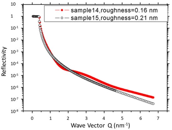 XRR measurements were also performed on polished Al2O3 (0001). The results showed that the root-mean-square roughness of the sapphire surface is around 0.2 nm, which is consistent with the AFM data (0.16 nm). XRR measurements provide more reliable statistical values than AFM data, which is limited to a narrow scanning area and is dependent on tip shape [11,12]. For the XRR data analysis, the Gen-X program, developed by Glavic and Björck [15], was used to fit the experimental results. Figure 7 shows the measurement of sample 14 on the as-polished sample without removing the surface contamination. Although sample 14 exhibited lower surface roughness at a pressure of 0.11 bar during the polishing stage, an organic thin film of about 1.2 nm was found on the surface via XRR measurement. Sample 15, polished at a lower pressure of 0.05 bar, exhibited significantly less contamination than the higher-pressure sample. In-plane sapphire diffraction peaks were also observed by GIXD. The six-fold symmetry of the in-plane diffraction peaks was identified by an azimuthal scan (Phi scan). The width of the rocking curves of the in-plane diffraction peaks, such as the (11–20) and (1–100) peaks, is 0.02°, which is limited by the divergence of the incident beam of the B17 beamline at the NSRRC. The FWHM of the radial scan of the in-plane peaks is also limited by the instrument resolution, indicating that the coherence length of the sapphire surface in the plane is larger than one micrometer.