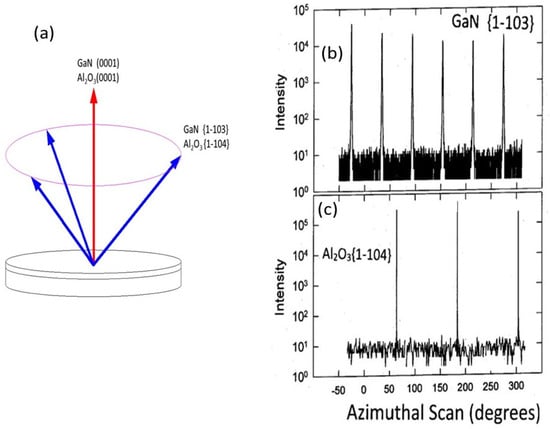 (a) The geometry of the hk-circle scan (or azimuthal scan) around the plane normal axis of GaN (0001) and Al2O3 (0001) axes. (b) The azimuthal scan of GaN {1–103}. (c) The azimuthal scan of Al2O3 {1–104}.